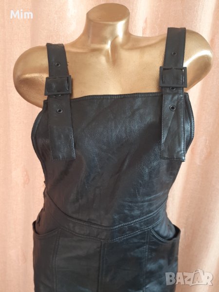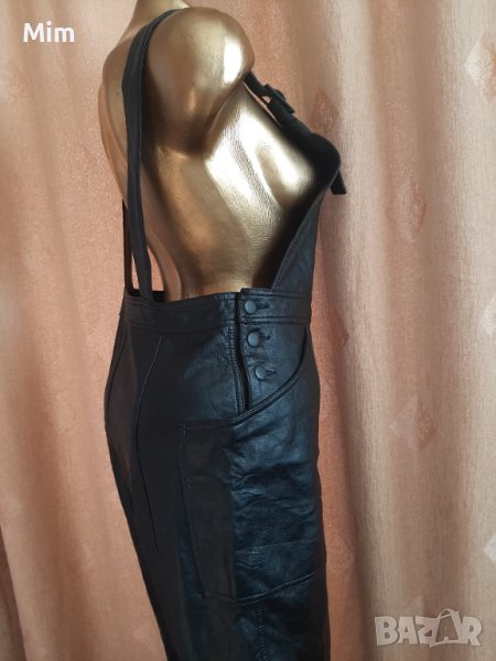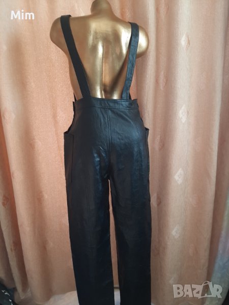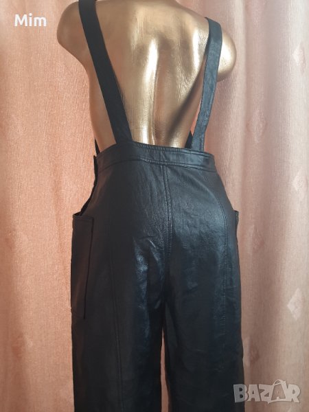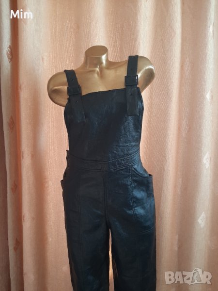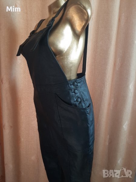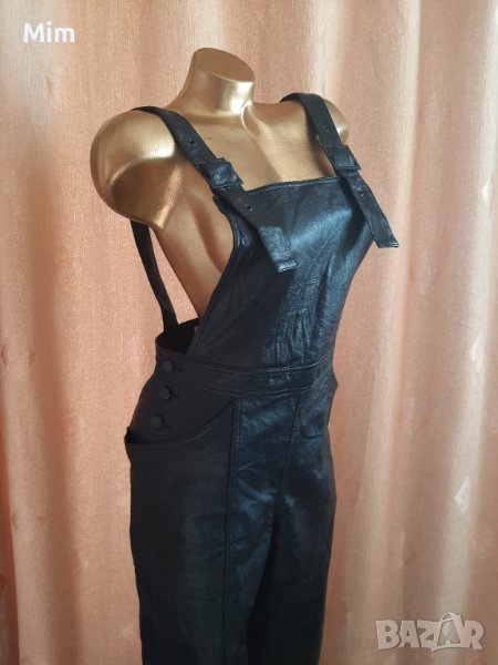 Черен кожен гащеризон с катарамка в горната част, странично с облечени кожени копчета и с външни джобове. Талия 40 см едностранно, ханш 52 см едностранно,дължина от талията 97 см завършва с маншет от 4 см ,широчина на крачолите 19 см едностранно. Няма забележки.