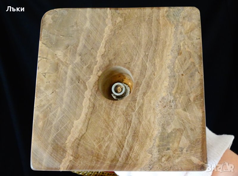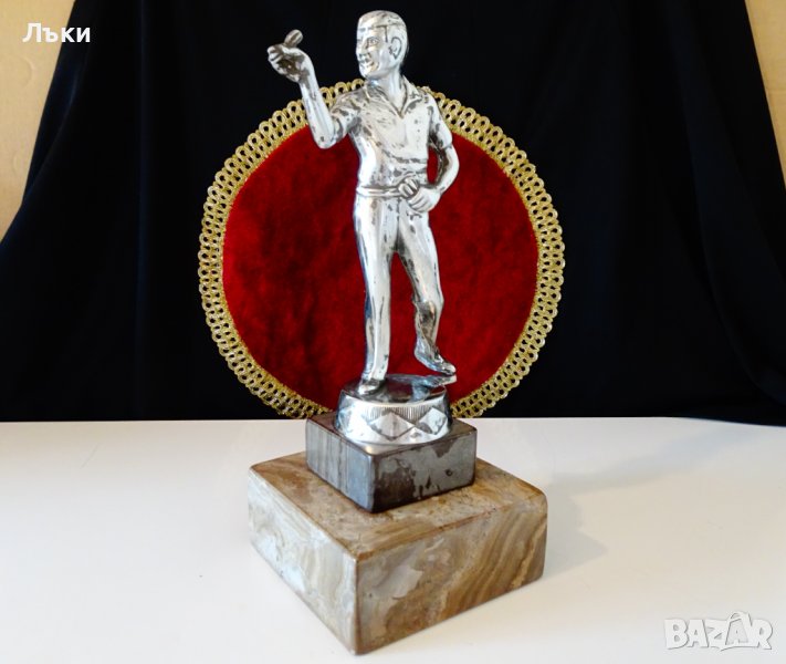 играч,ръчно изработена от калай.Има основа от два вида мраморен оникс.Височина 30 см.,височина само на фигурата 23 см.Основата е с размер 12 х 12 х 5,другата