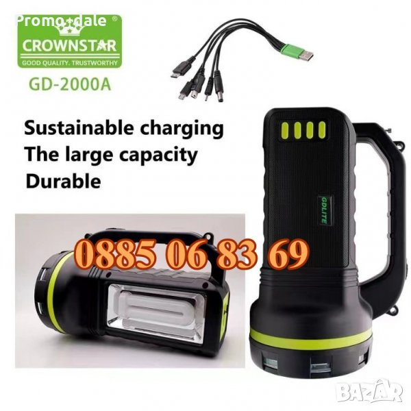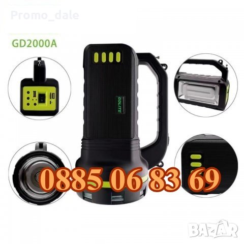 Соларна система GDLITE GD-2000A, включваща соларен панел, акумулаторна батерия, фенер, тонколона с Bluetooth и радио, 3 броя Led крушки, кабел за зареждане на различни телефони и презрамка за носене на рамо. В комплекта са включени три диодни лампи с кабели. Системата позволява няколко варианта за осветление, вграден фенер отпред и лампа отстрани.
