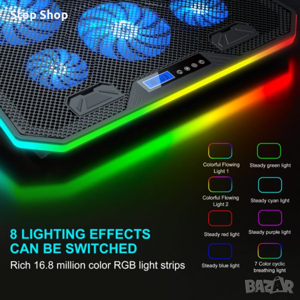 - 【6 високоскоростни и безшумни вентилатори】 Охлаждащата подложка за лаптоп се състои от 3 малки вентилатора и 3 големи вентилатора. Осигурете силен вятър, за да намалите ефективно температурата на вашия лаптоп. В същото време вентилаторите са добавили кондензаторни компоненти за намаляване на шума. Почти няма звук, когато компютърът е поставен върху него. LCD екранът позволява управление на 6 скорости и режими на вентилатора и 8 rgb светлини.