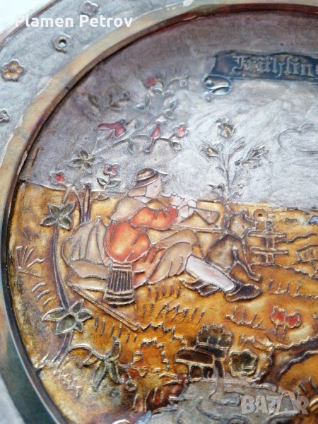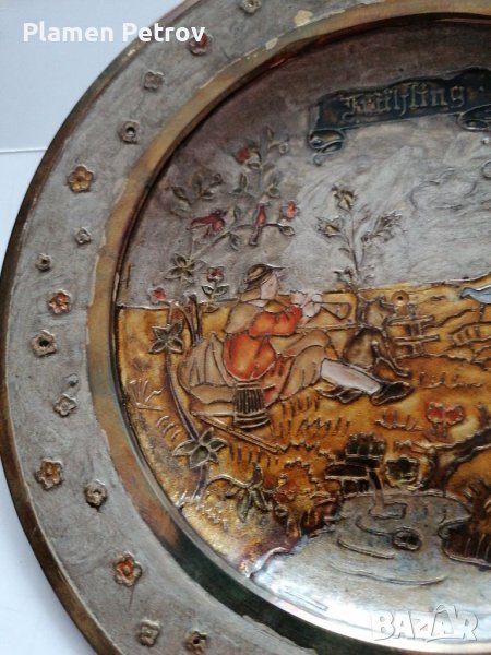 Нова бронзова чиния за стена с фолклорни мотиви, овчар с кавал и стадо от овце, цветен емайл размерите са диаметър 23 см