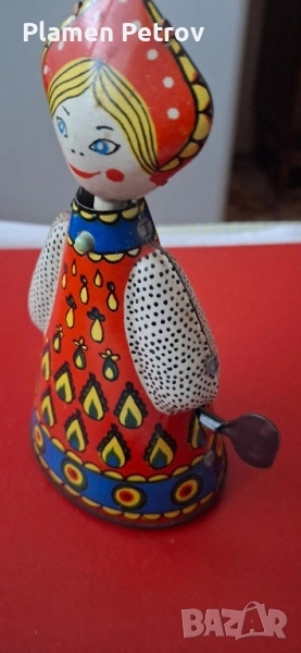 Стара съветска детска играчка/механична/ от ламарина в цветно, навива се с ключа и танцува без забележки са предметите МАТРЬОШКА СССР