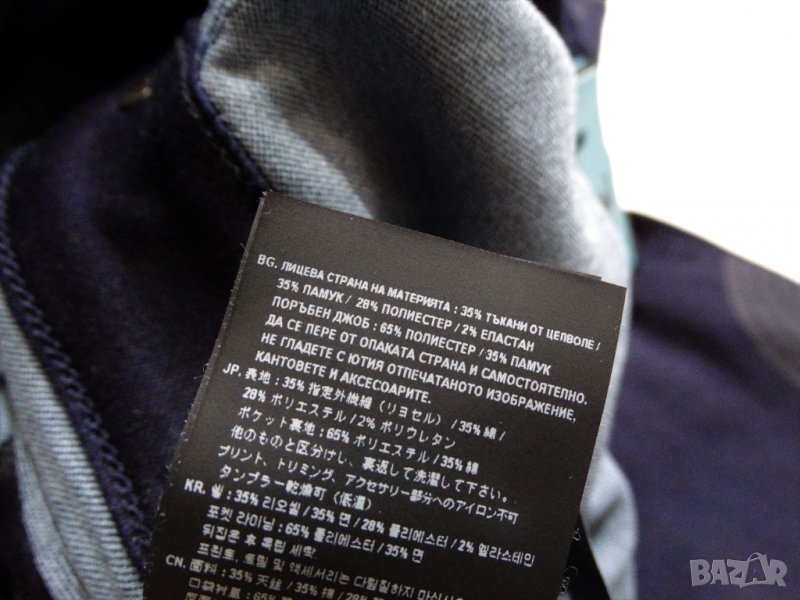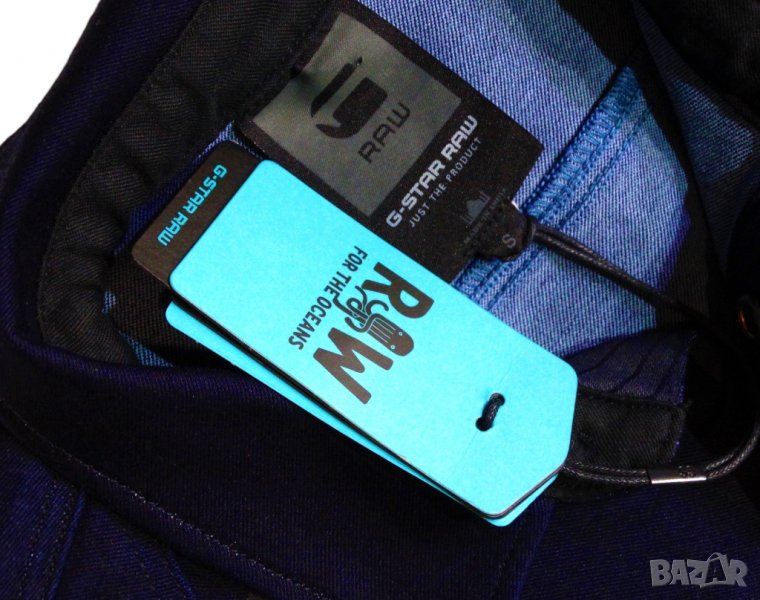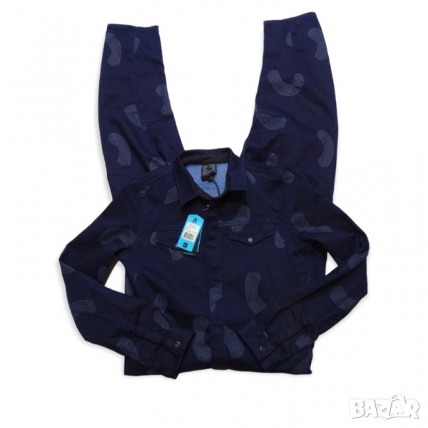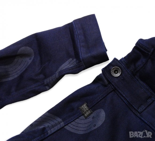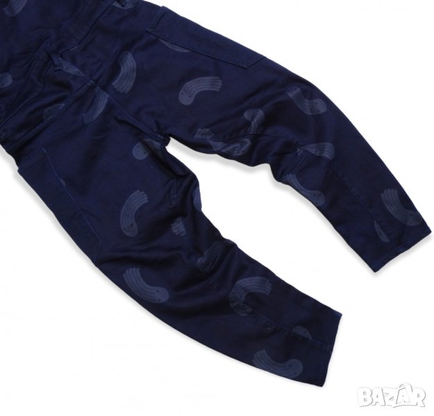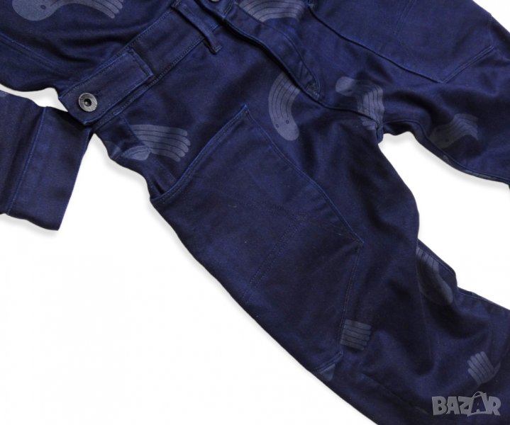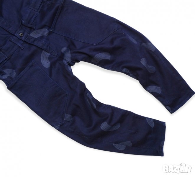 Нов дамски гащеризон от колекцията Pharrell Williams x G-Star Raw for The Oceans за опазване океаните от замърсяване. индигов цвят с принт, еластична материя (деним) от 35% тъкани от целволе, 35% памук, 28% рециклиран полиестер и 2% еластан. Закопчаване с тик - так копчета.