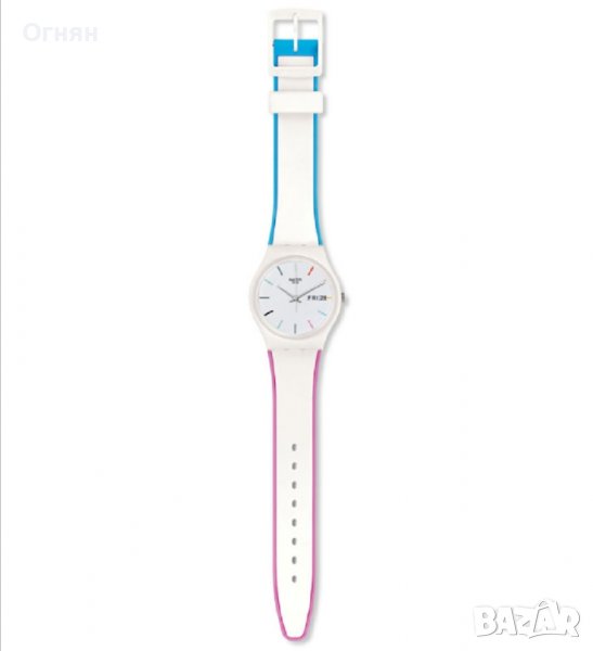 БЕЛИЯ ЦИФЕРБЛАТ С МНОГОЦВЕТНИ ИНДЕКСИТЕ И ПРОЗОРЕЦ С ДЕН И ДАТА НА 3 ЧАСА СА ПРЕДСТАВЕНИ С ФРАГМЕНТИ ОТ ЯРЪК ЦВЯТ. МАТОВО БЯЛАТА ПЛАСТМАСОВА КУТИЯ Е СЪЕДИНЕНА ОТ МАТОВА БЯЛА И СИНЯ (12 ЧАСА) И РОЗОВА (6 ЧАСА) ДВУСЛОЙНА СИЛИКОНОВА КАИШКА, БЯЛА СИЛИКОНОВА ПРИМКА И МАТОВО БЯЛА ПЛАСТМАСОВА КАТАРАМА, ЗА ДА ПОДЧЕРТАЯТ СТИЛА.