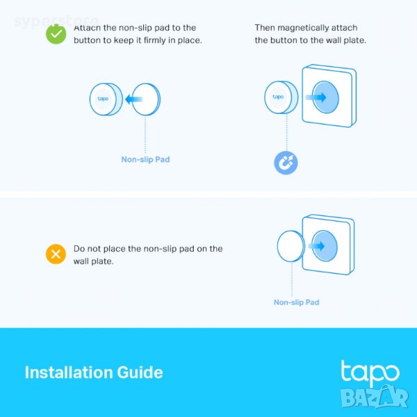 Сменете старата си стенна плоча с включените винтове или залепете бутона навсякъде с предоставените лепила. Можете също така да прикрепите превключвателя без стенна плоча върху всякаква магнитна повърхност. Поставете го където пожелаете и бутоните за управление на осветлението са винаги на една ръка разстояние.
