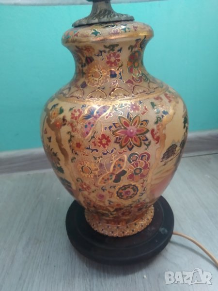 стара настолна лампа ,дървена основа порцеланов корпус,маркировка-сатцума,техника клетъчен емайл.