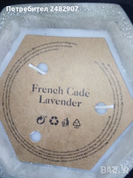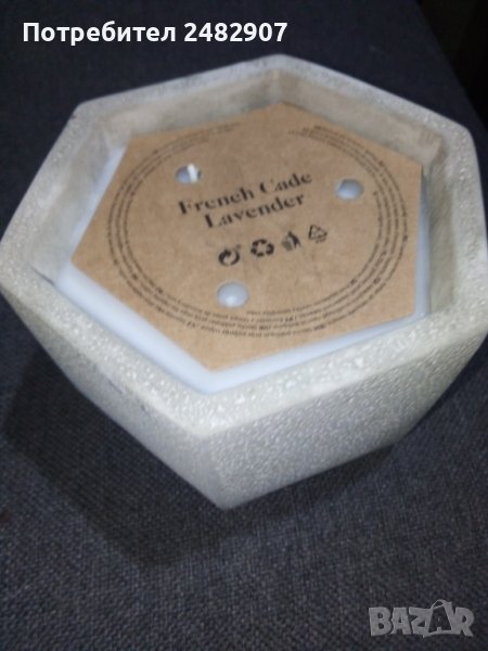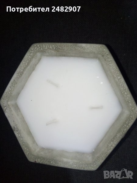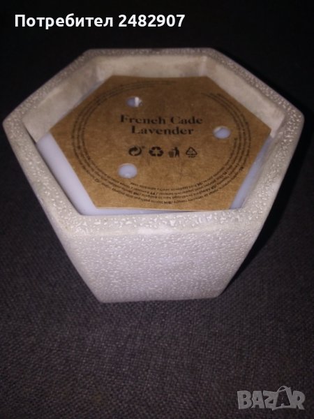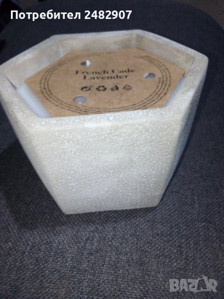 Декоративна ароматна свещ "Лавандула" с три фитила в циментов шестоъгълен масивен свещник, имитация на камък. Чисто нова, не е използвана. Размери - 13/11,7 см, височина - 7 см. Идеална за подарък.