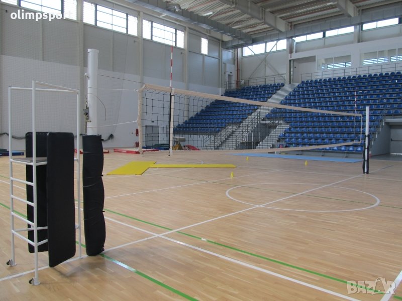 Стойки волейбол алуминиеви: – стойки за волейбол с регулируема височина и външен обтегач с ръкохватка – материал – специален усилен алуминиев профил 120х100 мм – всички елементи за закрепването на мрежата и обтягащото устройство са насочени извън терена – цената е за к-т от две стойки – комплектът не включва волейболната мрежа, волейболните антени, предпазителите и съдийския стол – те могат да бъдат поръчани отделно