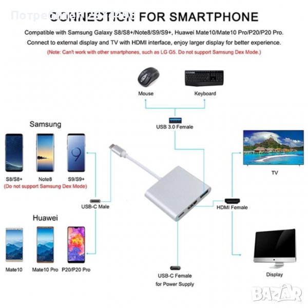 Свързване на три разлизчни устройства към тайп С ;