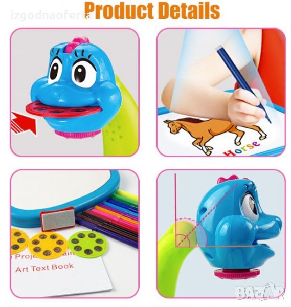 Projector painting е страхотно решение за всички малки творци. Нека детето ви рисува на воля всички популярни фигури и животни, напълно само. С помощта на светещия прожектор се проектират забележително точно изображенията от трите различни диапозитива. Projector painting е страхотен за развиване на координацията и точното прерисуване при по-малките деца. Иновативната играчка предлага проектиране на забавни изображения върху хартия. Лесен и забавен за употреба.
