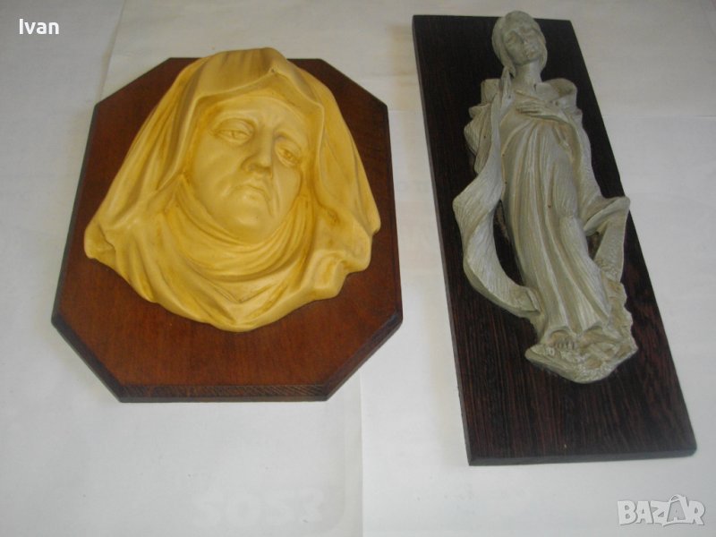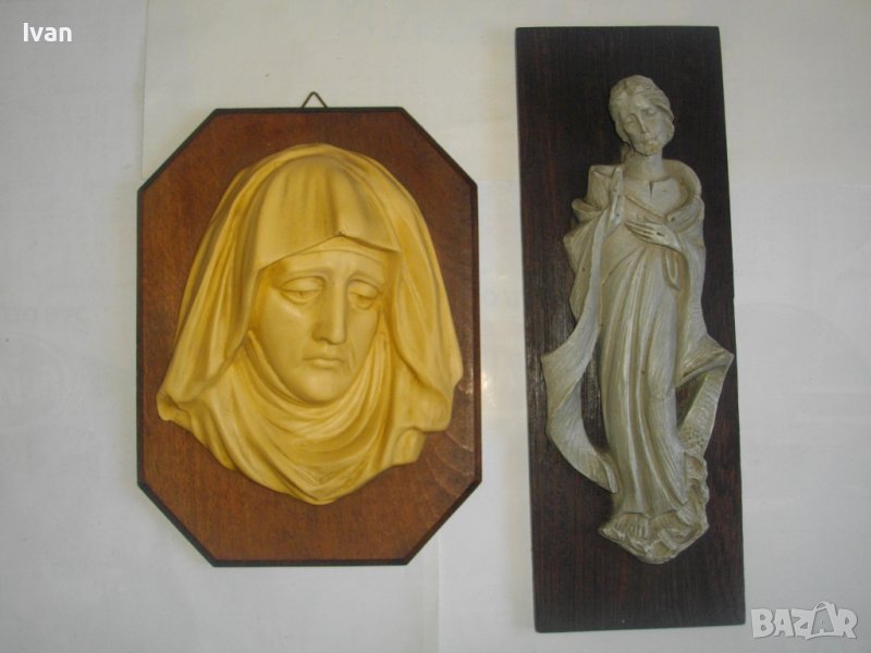 По-малката икона е с порцеланова изображение. Представлява жена/монахиня - само лице. Размери на дървената основа - 24,5 см х 18,5 см. Бук лакиран. Размер на изображението релефно - 18 см х 16 см. Релеф - приблизително 6 см. Гърба е с метална кукичка за окачване.