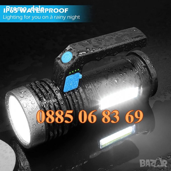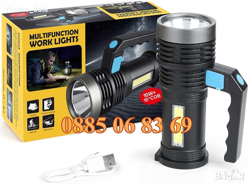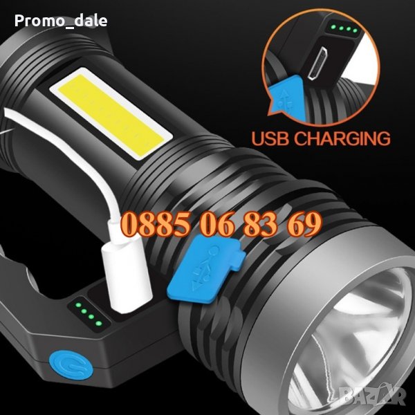 LED фенер с акумулаторна батерия, зареждане чрез Micro USB кабел и удобна дръжка за пренасяне.
