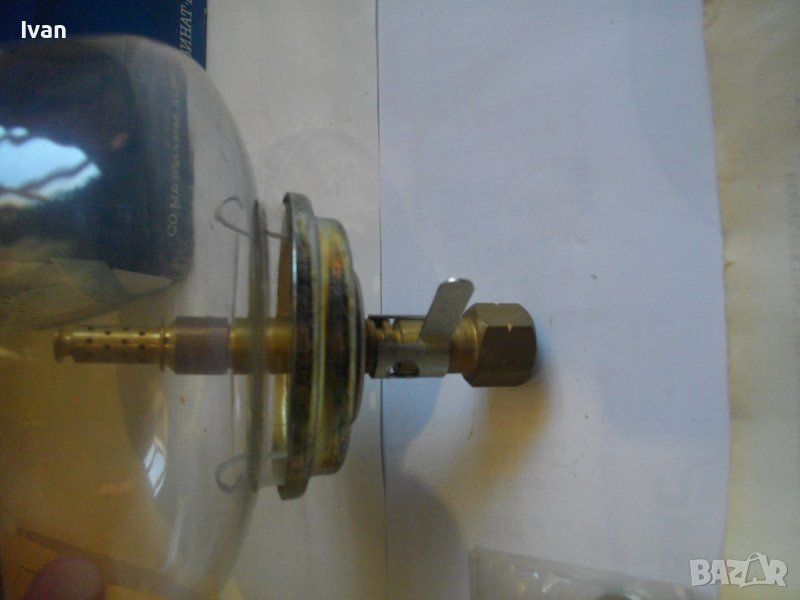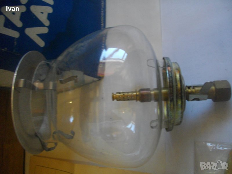 Съвсем нова, неизползвана и неупотребявана газова туристическа осветителна лампа, работеща при скачване на газов котлон.