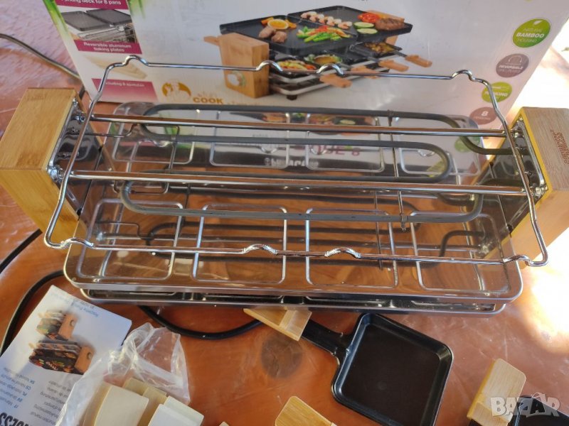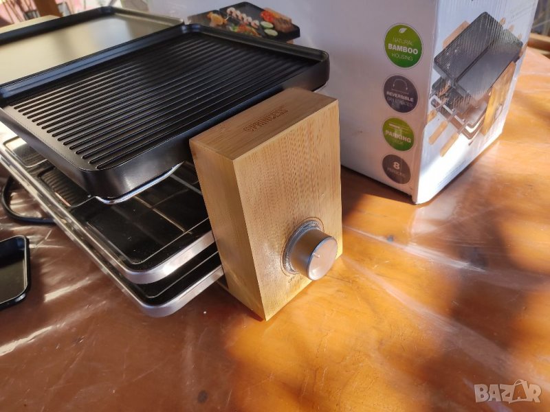 Луксозният Princess Raclette Pure 8 е страхотна гледка на всяка маса с красивата си бамбукова кутия. Двете реверсивни плочи за скара от лят алуминий имат гладка и оребрена страна, така че можете да избирате между функции за грил и тепаняки. Голямата повърхност за печене на Princess Raclette Pure 8 е с размери 41,8 x 23 cm, така че до осем души могат да се съберат около масата, за да се забавляват заедно в готвенето. Благодарение на мощността от 1200 вата, Princess Raclette Pure е бързо готова за употреба. Температурата може да се регулира непрекъснато с помощта на въртящ се контрол със светещ пръстен. Горещите тигани могат да се поставят в интегриран рафт, за да могат да изстинат и да не оставят петна по покривката. Princess Raclette Pure 8 се почиства лесно. Грил плочите са подходящи за съдомиялна машина, а корпусът от бамбук и тиганите могат лесно да се почистват с влажна кърпа.