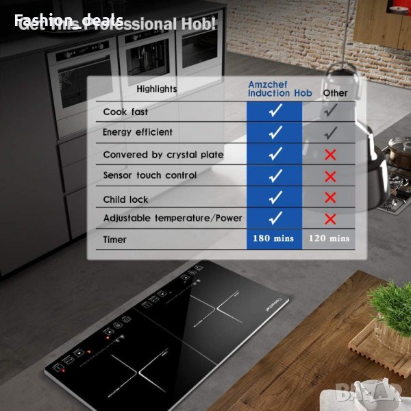 Индукционният котлон разполага с 10 температурни нива, 9 нива на мощност за левия котлон и 5 нива на мощност за десния котлон