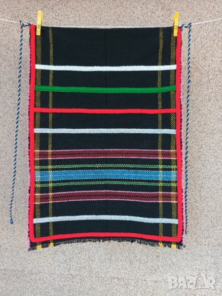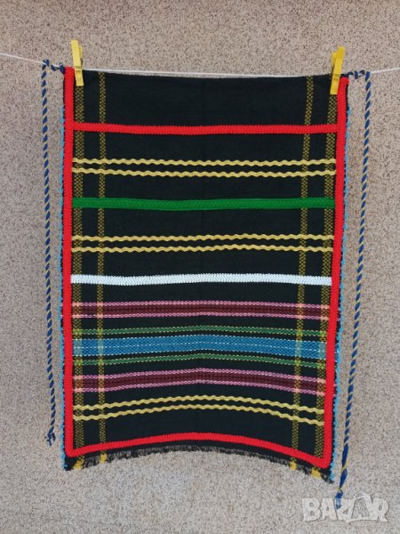 Престилка която става за предна или задна престилка, цветна на райета със златист зиг-заг и орнаменти широчина 58 см дълга 71 см.