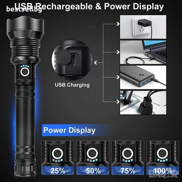 Мощен прожектор XHP90 тактически лед фенер P90 зареждане USB къмпинг