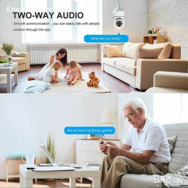Въртяща се куполна камера тип крушка с ъгъл на видимост 360° и вградени микрофон и говорител.