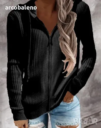 Останете уютни и стилни тази есен-зима с нашата дамска ежедневна жилетка с качулка. Отличаващ се с оребрена плетена текстура, цип по цялата дължина и дълги ръкави, този суичър е идеален за наслояване. Идеален за небрежни излизания и ежедневно носене, той е задължителна част от гардероба.