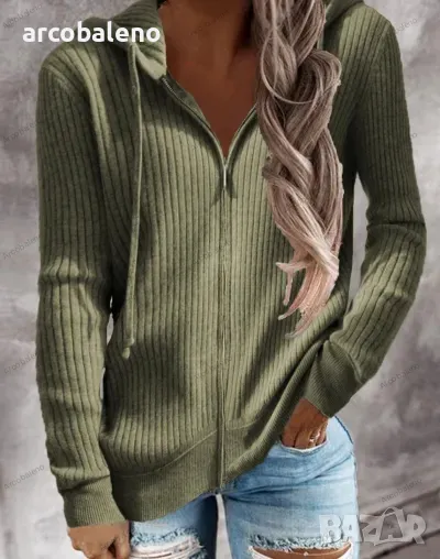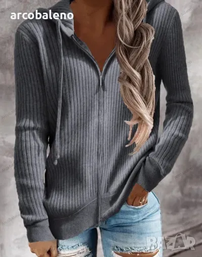 Останете уютни и стилни тази есен-зима с нашата дамска ежедневна жилетка с качулка. Отличаващ се с оребрена плетена текстура, цип по цялата дължина и дълги ръкави, този суитър е идеален за наслояване. Идеален за небрежни излизания и ежедневно носене, той е задължителна част от гардероба.