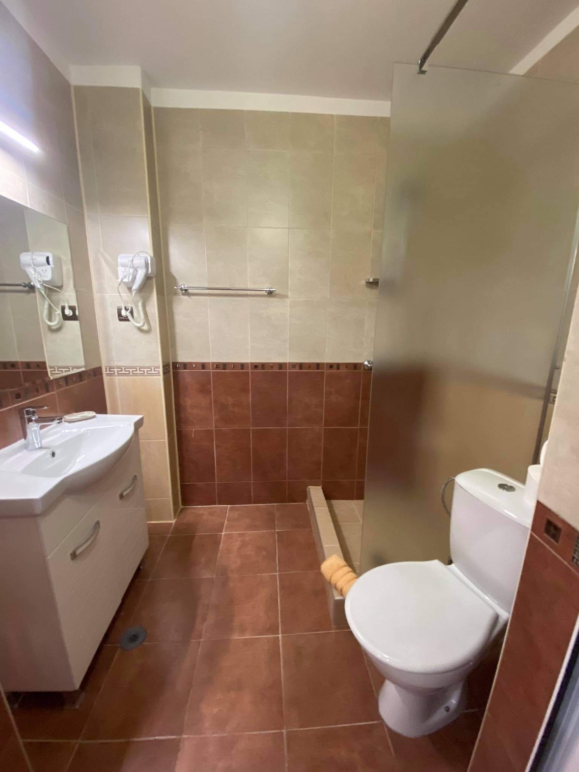 Първия етаж входен, приземен е със застроена площ 159.03 м2 и включва входен вестибюл ( рецепция лоби ) , изба ( стая за персонал и охрана ) , машинно помещение с асансьорна клетка и стълбище за 4 етажа , фитнес ( СПА ) и две стаи със самостоятелни санитарни помещения .