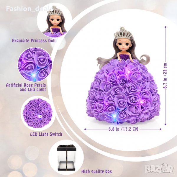 Комбинация от рози със сладка кукла и топли бели LED светлини