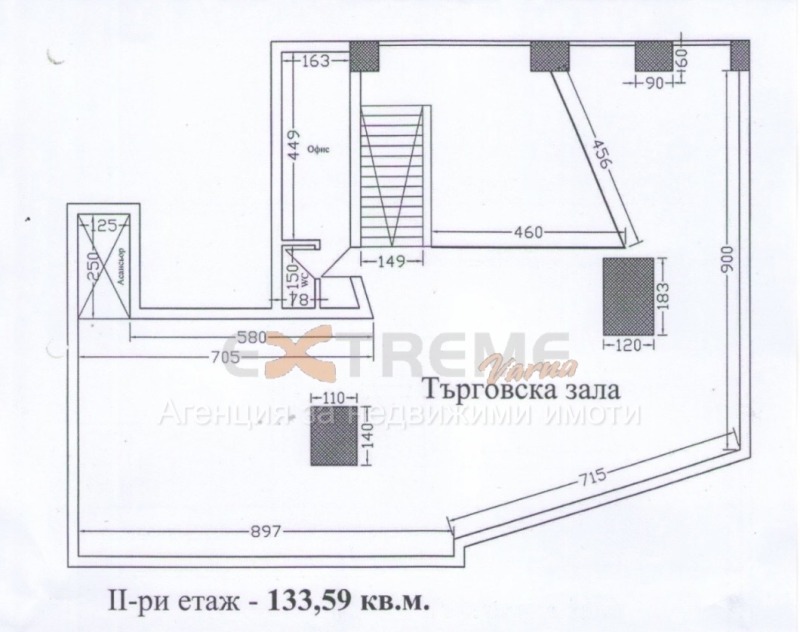 Втори етаж-133,59 кв.м. търговска зала, офис, санитарно помещение.
