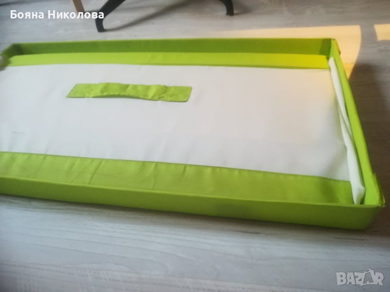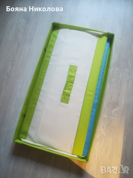 Платненият кош е с мрежи за проветрение, две лица (зелено и синьо), сглобява се с лепки, а сгънат е много компактен.