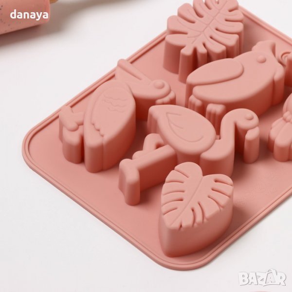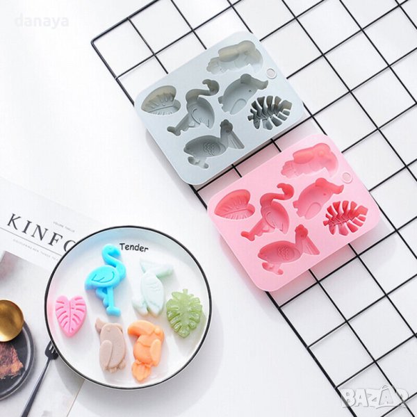 Силиконова форма с различни тропически птици и тропически листа, общо 6 гнезда. Формата е подходяща за шоколад, желирани сладкиши, защо не и мини мъфини. Може да се използва и като форма за лед с нестандартни по форма кубчета. Кубчетата лед с форма на папагали или фламинго ще изглеждат впечатляващо в чаша за коктейли с любимата напитка. Формата е подходяща и за отливка на сапуни или декорация на торти и сладкиши. Дайте воля на въображението си и пригответе тропически сладки, лед, или формички за декорация на сладкиши!