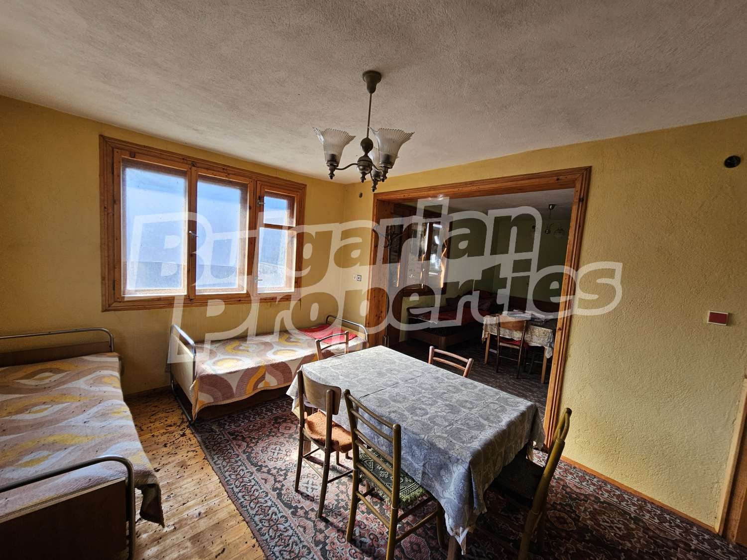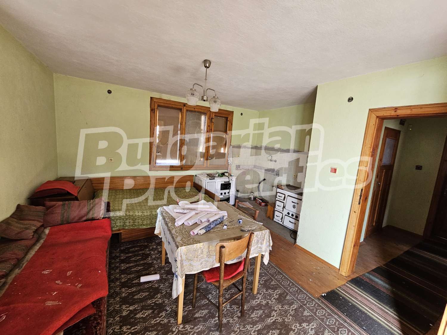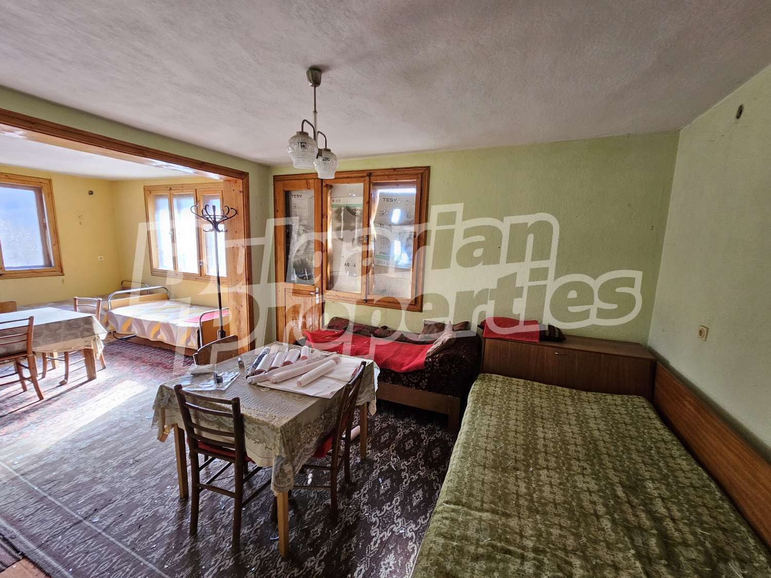 Настилки дюшеме, дограма двойна дървена, стени - мазилка.