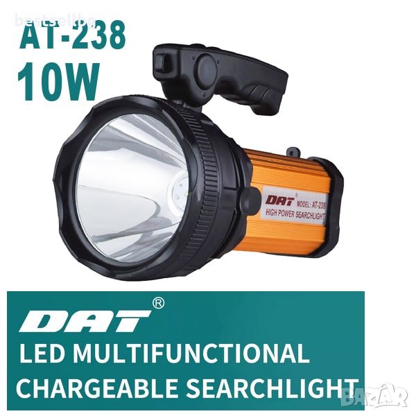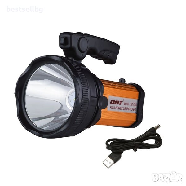 DAT High Power Searchlight Акумулаторен прожектор 10W с 1 страничен CREE COB Много силен акумулаторен фенер прожектор с 1 CREE LED диод с обща мощност 10W и странично осветление за лампа или къмпинг лампа CREE COB USB изход фенерът може да се използва като power bank за зареждане на други устройства