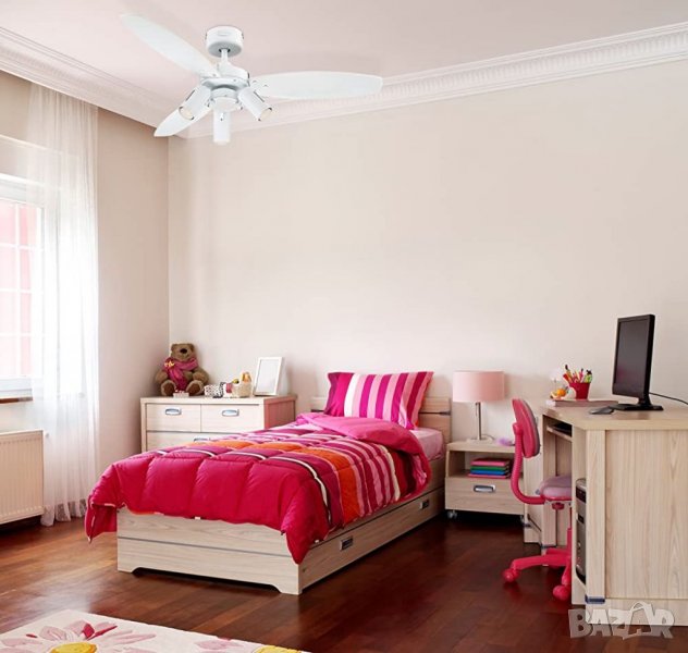 Модерен вътрешен вентилатор на тавана 105 см, бял, идеален за помещения до 20 кв.м с нормални или скосени тавани