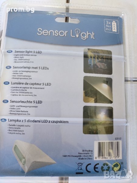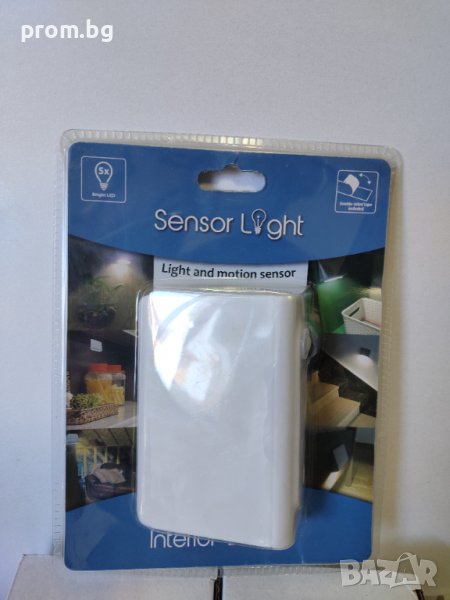 LED сензорна лампа, внос от Белгия. Обсег на засичане - до 3м. Подходяща за шкафове, стълбище, за кухнята, в антрето, за гардероби, мазе и др. Размери: 11 см х 3 см х 8 см. Осветлението е посредством 5 светодиода. Работи с батерии 3хААА (не са включени). Закрепя се с ленти на гърба на лампата.