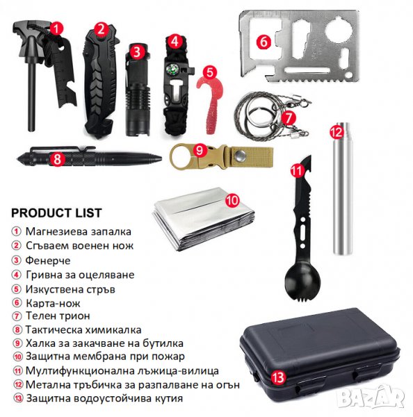 военен нож, Фенерче, Гривна за оцеляване, Изкуствена стръв, Карта нож, Телен трион, Тактическа химикалка, Халка за бутилка, Термо одеяло, Лъжица-Вилица, Тръбичка за разпалване на огън, Водуостойчива кутия.