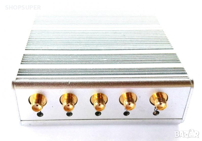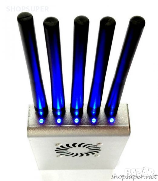 заглушител на сигнал за всички мрежи по света . Може да работи нон стоп, когато е свързан в електрическата мрежа . Производителя не споменава , но във видеото се вижда , че заглушава 5G сигнал ! Блокира телефони , тракери и интернет рутери на няколко метра разстояние . Има 5 антени , 5 светещи индикатора , 5 DIP превключватели за съответните честоти , които могат да се включват / изключват заедно и поотделно без да оказват влияние един на друг по време на работа . Работи с една вградена акумулаторна батерия . Отдолу на корпуса има 3 отвора с резба за монтиране на тринога стойка по желание .