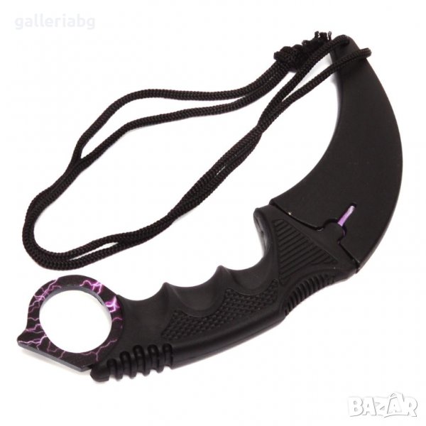 нож с късо метално острие и черна дръжка. Предлага се с калъфче с дръжка.