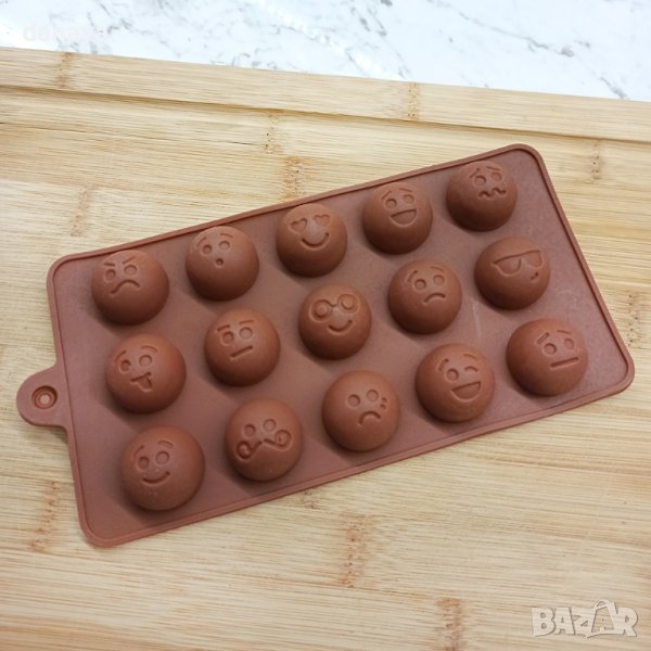 Силиконова форма за шоколадови бонбони Емотинки. Emoji форми за домашни шоколадови или желирани бонбонки с 15 гнезда с различни емотинки – весели, тъжни, усмихнати, влюбени или закачливи личица. Може да се използва и като форма за лед.