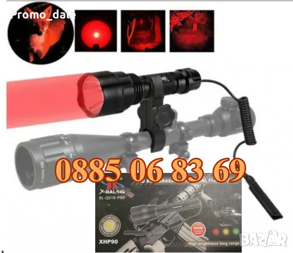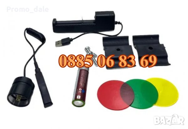 LED акумулаторен прожектор със спусък-накрайник за лов. Два броя удължители за регулиране дължината на фенера. Три лещи червена, зелена и жълта. Скоба за захващане/монтиране на пушката.