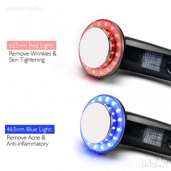 • Синя светлина: Дължина на вълната 440nm, прониква в кожата 1 мм - успокоява алергичната кожа, премахва пъпките, премахва бактериите от акне; стимулира естественото генериране на повече колаген, затваря разширените пори, регулира омазняването, действа за отстраняване на бактериите, причиняващи акне.