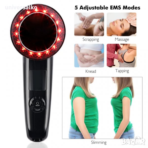 * Ултразвуковият масажор е мултифункционален уред за терапия на тяли и лице от ново поколение способства за подобрявне на пропускливостта на цитомембраната, за промяна на анаеробното състояние на клетките, да подобри абсорбционната способност на клетките, както и подладяващ ефект върху кожата благодарение на своята фото терапия, да стимулира образуването на колаген и енергизуране на клетките.Симулира топенето на подкожни мазнини и премахване на целулит.