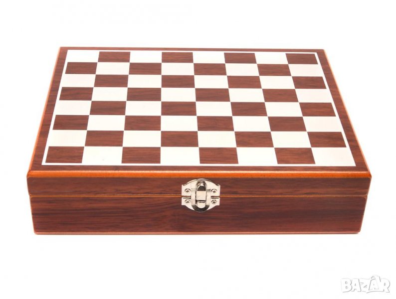 Дървена кутия - шах и фигури също от дърво, наредени на вътрешната страна на капака.