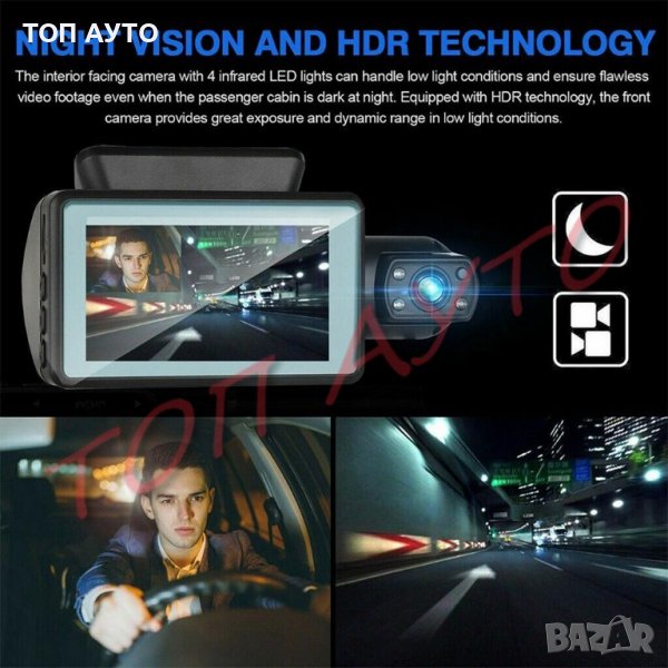 автоматичния нощен режим и IR светлини, не се влияе от насрещни фарове. Независимо дали е слънчево, мъгла, дъжд, сняг, нощ, с трафик или без трафик, камерата ще улови всеки един момент и всеки един автомобилен номер. Записва върху microSD карти с размер до 32GB. Ако мястото ви свърши докато шофирате, то автоматичната функция Loop ще ви позволи да шофирате без да спирате, като просто ще започне да презаписва върху стари видео файлове. Видеорегистраторът има и сензор за движение. Докато автомобилът ви е на паркинг, камерата ще се включва автоматично при зловредни действия или ако някой ви удари на паркинг и ще запише всичко. Ясно и чисто изображение със 170° широкоъгълен обектив при 30 кадъра в секунда. Това позволява на камерата да заснеме по-подробни кадри при всякакви пътни условия и да заснеме номера на други шофьори. Вътрешната камера е оборудвана с 4 инфраред лед светлини, което позволява записване на видео