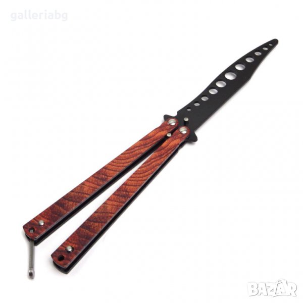 Тренировъчен джобен нож тип пеперуда с черно острие и дръжка имитация на дърво.
