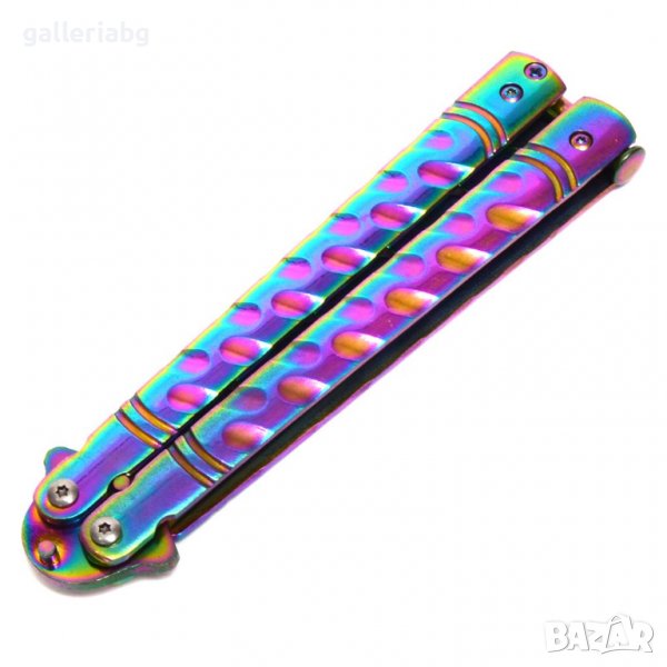 Тренировъчен джобен нож тип пеперуда, изработен от цветен метал.
