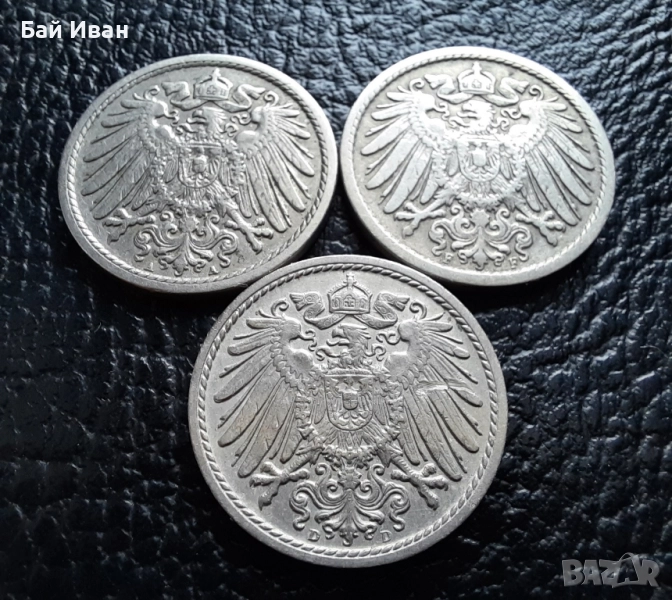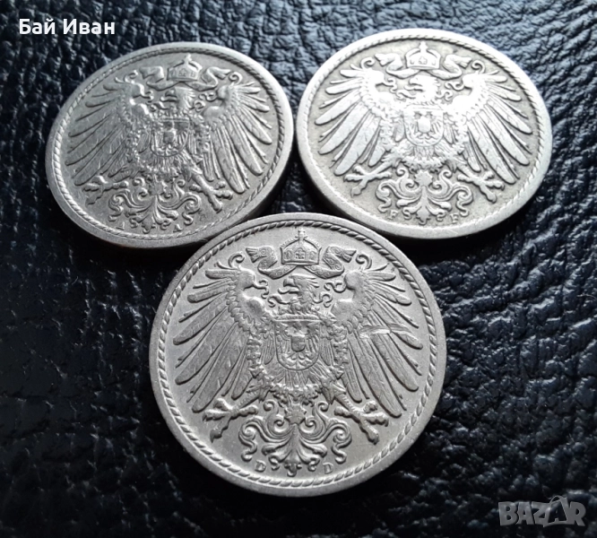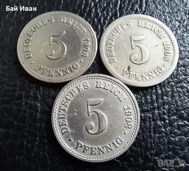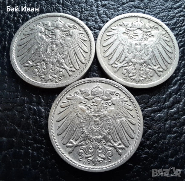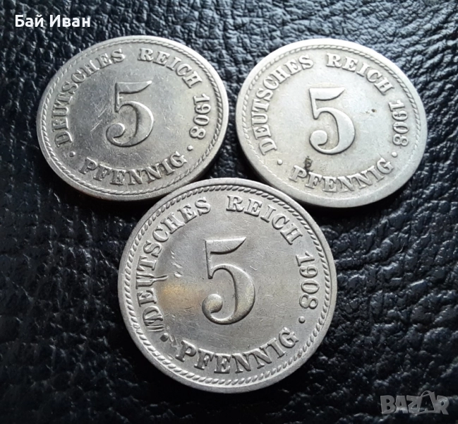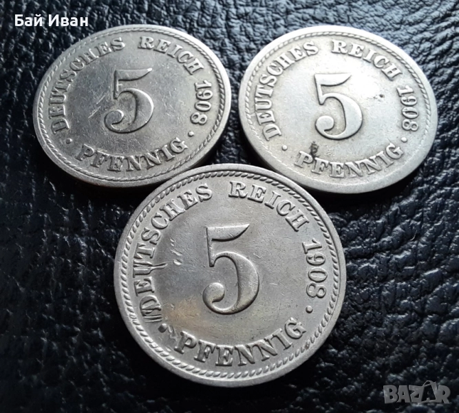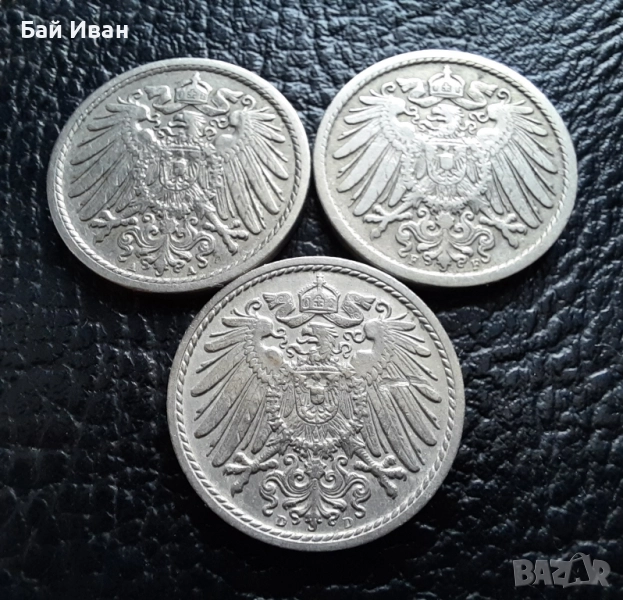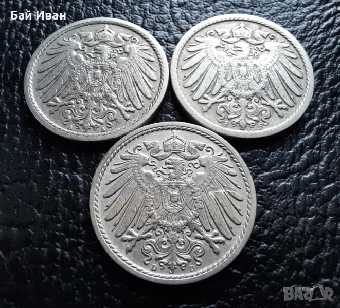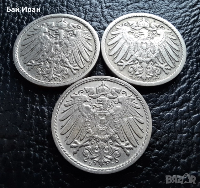 Стара монета 5 пфенига 1908 г. букви A , D и F - Германия -три разновидности ! → Обява 39779148