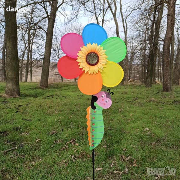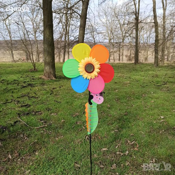 Голяма ветровъртележка. Декорация за градина, балкони, саксии – голяма вятърна въртележка с форма на пъстро цвете и слънчоглед в центъра си. Интересното на този модел е, че по стеблото на цветето има голяма весела гъсеничка. Ветровъртележка в свежи ярки цветове, които ще внесат лятно настроение, където и да ги поставиш. Въртележките се въртят от вятъра. Може да я поставиш в градината като декорация.