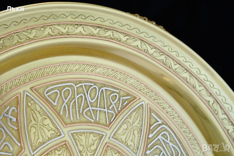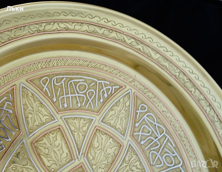 сребро релефни букви,арабска калиграфия,тугри,чието послание е тайна за мен.Орнаментите и буквите са обградени с рамка от мед и сребро и образуват красиво цвете в центъра на подноса.Възхитително виртуозна работа,съчетала