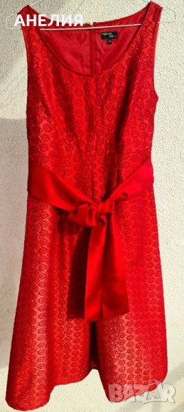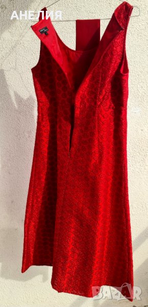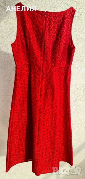 Елегантна нова испанска рокля без ръкави за официални събития ( бал, сватба, рожден ден, кръщене и др.), ефектен втален модел с висока талия, с лека подплата, удобен дълъг цип на гърба, басти и плоха отпред, широк копринен пояс, цвят преливащо червено, платът е с ефирна бродерия, дължина под коляното, р-р: 40/М.