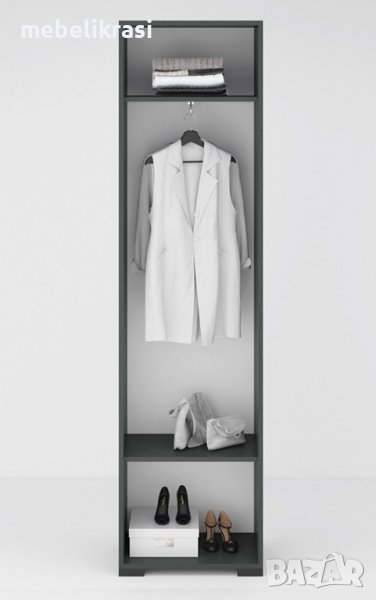 "Денвър Конфигурация 1" е модулно портманто, предоставящо всичко необходимо за Вашето антре или коридор. Моделът включва: еднокрилен гардероб с лост за закачалки и рафтове; пано с четири закачалки и рафт; огледало; шкаф с врата и ниши - за Вашите малки вещи; нисък шкаф с падаща врата, подходящ за обувки; Изработва се от ПДЧ - 16 мм. в цветовете Дъб вотан и Антрацит.