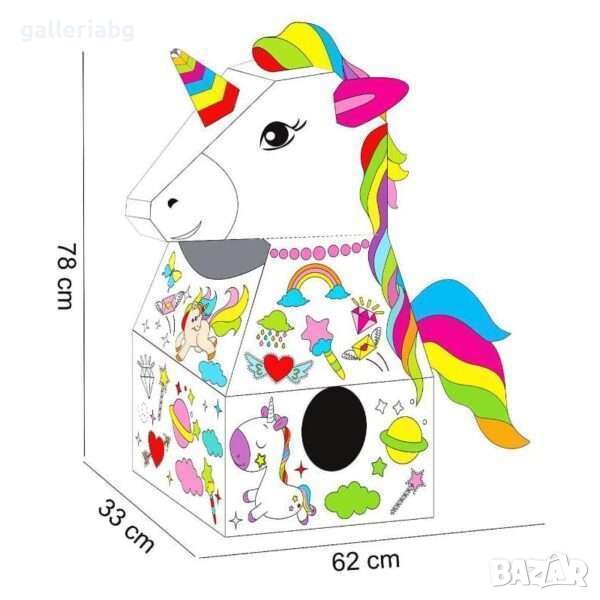 Страхотен тип американски детски картонен костюм за игра и много забавления. Комплектът включва бои, с които сами да оцветите своя костюм. Изберете еднорог за момиче или кола за момче.